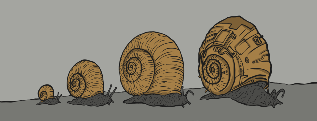 Our paper introduces a post-growth perspective to HRI, by inviting the community to shift the focus from quantitative growth to qualitative development. We reuse the metaphor of the snail (broadly used by the degrowth and slow movements) and add a new ring on the snail’s shell—a layer of automation, artificial intelligence, and robotics, built upon already complex structures. While intended to enhance efficiency and productivity, this continual layering risks creating fragility, dependence, and ecological or social imbalance. The metaphor thus warns of the limits of accumulation and invites reflection on how to achieve balance for HRI.